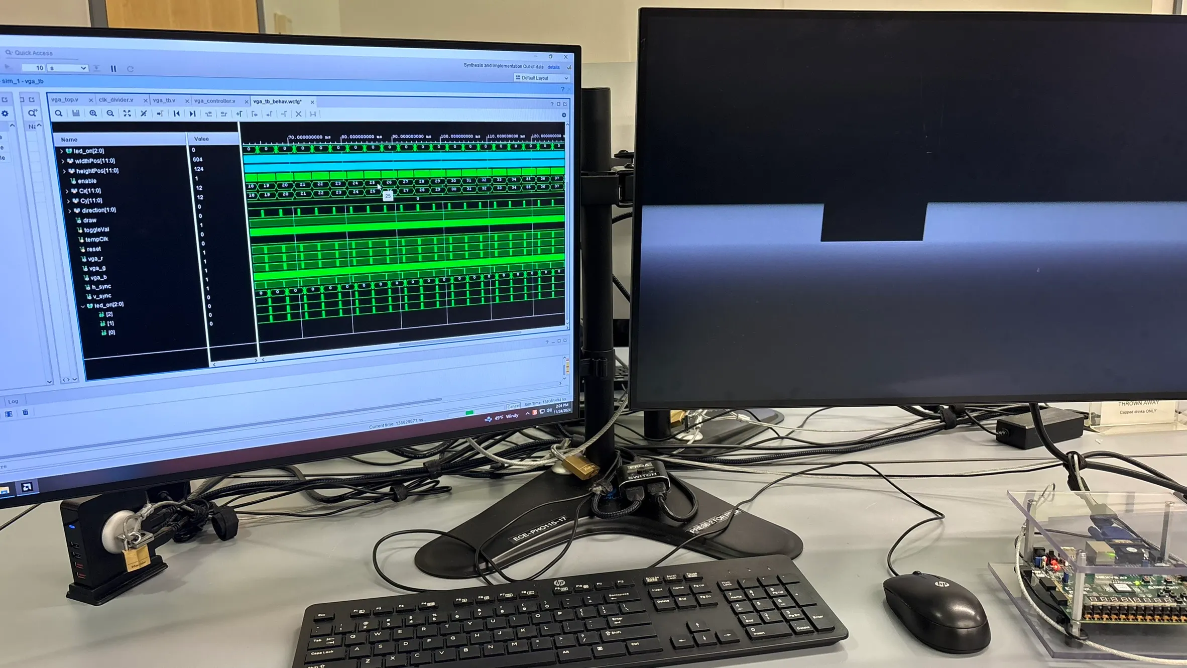 This was my first time building an interactive system fully in hardware, so managing VGA timing, clock division, and synchronous logic took careful debugging. Early versions had misaligned coordinates, unstable sync signals, and inconsistent collision checks. Through simulation and hardware testing, I learned how to structure HDL cleanly and fix timing-related issues.